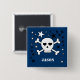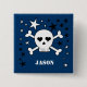 Um botão divertido, com um crânio azul giro e design de ossos cruzados rodeados por estrelas. O impressão de nome sob o design e a cor de fundo são totalmente personalizáveis.