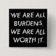 Descrição da imagem: leitura esbranquiçada de letras brancas, "Somos todos fardos. Todos nós valemos a pena." Esta mensagem é suposta contrariar a ideia de que ninguém é um fardo, ou de que ser um fardo é uma coisa má. Especialmente como uma pessoa deficiente, é fácil sentir que você é um fardo para as pessoas ao seu redor. E às vezes isso é verdade, mas isso não é ruim. Tudo bem ser um fardo, porque todos estão em um ponto ou outro, e você vale o esforço.