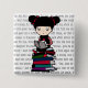 Uma menina senta-se em uma pilha de livros ao ler. O fundo é um trecho de um conto de fadas.