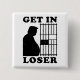 Botão de presente político engraçado para as comícios de protesto e a cabine de eleitores. Gráfico negro de um portátil e corrupto Donald J Trump indo para a prisão por todos os seus crimes. "Entra em perdedor". Arte negra desapontada.