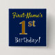 Este simples design de botão quadrado apresenta uma mensagem como "primeiro aniversario do Primeiro Nome!", com as "ruas" com um aspecto de cor falsa/imitação dourada, sobre um fundo de cor azul. O nome pode ser personalizado. Botões como estes talvez pudessem ser vestidos por convidados numa festa de aniversário para alguém que comemora seu primeiro aniversário, onde a festa está sendo realizada em uma grande área com muitas outras pessoas presentes (como um parque urbano ou um parque temático). [~Z0000164]