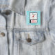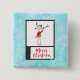 Crachá de botão com uma ilustração branca e engraçada de uma rena de Natal engraçada em um suéter feio, perfeito para a temporada de festas. Ele está de pé em duas pernas e balançando olá. Ele tem grandes galhadas e um boné de inverno verde e bonito. O texto abaixo diz Feliz Natal em letra manuscrita, em cor vermelha festiva. O fundo é um design de cor d'água com aspecto gelado azul.
