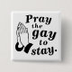 Botão quadrado em um fundo branco com texto preto e ilustração. A ilustração está na parte inferior esquerda e está de mãos rezadas. À direita das mãos, em letra serif curva, lê: "Reze pela gay para ficar."