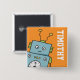 Crachá bonito do pino do quadrado do robô que pode ser personalizado com um nome de sua escolha. Estas características de design brilhantes e vibrantes um robô azul e verde feliz em um fundo alaranjado com escrita branca. © Lisa Marie Robinson de Copyright. Todos os direitos reservados.
