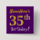 As características deste design quadradas simples do botão uma mensagem gostam de "aniversário NameHere do 35o! ", com "35o" tendo o falso/imitação ouro-como o olhar da coloração, em um fundo colorido roxo. O nome pode ser personalizado. Os botões como estes poderiam talvez ser vestidos por convidados em uma festa de aniversário para alguém que está comemorando seu trigésimo quinto aniversário, onde o partido está sendo realizado em uma grande área com lotes de outras pessoas atuais (como um parque da cidade ou um parque temático). [~Z0000166]