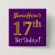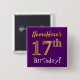 Este simples design de botão quadrado apresenta uma mensagem como "NameHere's 17th Birthday!", com o "17º" a ter um aspecto de cor dourada falso/imitação, num fundo cor roxa. O nome pode ser personalizado. Botões como estes talvez pudessem ser vestidos por convidados numa festa de aniversário para alguém que comemora seu 17.º aniversário, onde a festa está sendo realizada em uma grande área com muitas outras pessoas presentes (como um parque urbano ou um parque temático). [~Z0000166]
