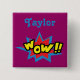 Um botão animado de tema em quadrinhos, este item apresenta um fundo roxo com "Uau" escrito em amarelo sobre um fundo em forma de estrela azul e vermelha. A parte superior apresenta o nome/texto do destinatário em azul. Personalize o seu hoje! Clipart: AnneIllustration https://www.etsy.com/shop/AnneIllustration