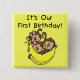 Três macacos pequenos, duas raparigas e um rapaz, e uma grande banana amarela em T-shirts de primeiro aniversario Triplets, fato físico, sacos de tote, cartões, autocolantes, ímanes e muito mais.