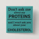 Este botão de diversão minimalista, com a frase "Não me perguntes sobre as minhas proteínas e não te perguntarei sobre o teu colesterol" em letras negras num fundo verde-claro-marinho, é o presente perfeito para cada vegano. Para pedidos personalizados, queira contactar-me em zolicestore@hotmail.com (permitir 1-2 dias úteis)