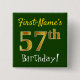 Este simples design de botão quadrado apresenta uma mensagem como "57º Aniversário do Primeiro Nome!", com o "57º" a ter uma aparência falsa/imitada de cor dourada, num fundo de cor verde. O nome pode ser personalizado. Botões como esses talvez pudessem ser vestidos por convidados numa festa de aniversário para alguém que comemora seus cinquenta e sete anos de aniversário, onde a festa está sendo realizada em uma grande área com muitas outras pessoas presentes (como um parque urbano ou um parque temático). [~Z0000163]