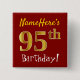 As características deste design quadradas simples do botão uma mensagem gostam de "aniversário NameHere do 95th! ", com "95th" tendo o falso/imitação ouro-como o olhar da coloração, em um fundo colorido vermelho. O nome pode ser personalizado. Os botões como estes poderiam talvez ser vestidos por convidados em uma festa de aniversário para alguém que está comemorando seu ninety quintos aniversários, onde o partido está sendo realizado em uma grande área com lotes de outras pessoas atuais (como um parque da cidade ou um parque temático). [~Z0000163]
