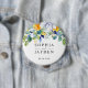 Um botão de casamento radiante e colorido com uma bela coloração aquosa folhagem botânica verde e folhas de eucalipto e elegantes flores brancas e ensolaradas. Celebre seu dia especial com este elegante botão de casamento amarelo floral, branco e azul. Apresentando um charmoso design com delicados florais amarelos, florais brancos sutis e sotaques azuis sutis, esse botão expele romance e sofisticação do eterno. Os refinados detalhes de tipografia e aquarela criam uma estética fresca e na moda, perfeita para casamentos de primavera e verão. Ideal para festas de noiva, convidados de casamento, ou como guardiã, este botão maravilhosamente desenhado adiciona um toque personalizado e elegante à sua celebração enquanto fazer uma lembrança adorável do seu dia especial.