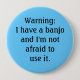Este botão lê, "advertência: Eu tenho um banjo, e eu não estou receoso usá-lo." Os jogadores do banjo, e outros fãs e músicos do bluegrass gostarão deste. Fundo azul.