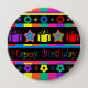 Design de aniversário com listras coloridas, estrelas, caixas de presentes e decoração floral