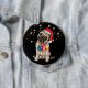 Este pino fofo apresenta um adorável cão pug que está vestindo 3 Enfeites de natal em uma fita ao redor do pescoço e um chapéu vermelho de Papai Noel. As estrelas Douradas estão cintilantes sobre ele. O texto lê Feliz WOOFmas!