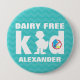 Miúdo livre da leiteria com figura do super-herói do menino no botão. Botão do alerta da alergia de comida da leiteria. Fundo da listra da viga da cerceta com símbolo da pia batismal branca e da "nenhuma leiteria". Personalize com nome ou o outro texto. Una às bolsas médicas à nota da "interior epinefrina". Pin à roupa, ao casaco ou à trouxa da criança para alertar outro da alergia de comida. O design pelo design pela alergia de Lil defende www.lilallergyadvocates.com