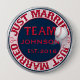 Botão de equipe personalizado da Equipe de recem casados 02-Baseball com tema BUTTON-A para famílias de união de casais. O centro é um fundo azul sólido. A estrutura externa é um padrão listrado vermelho e branco. O texto vermelho decorativo circula ao redor do quadro externo e diz: RECEM CASADOS duas vezes. No centro está o texto decorativo: TEAM e o sobrenome dos clientes. Estabelecido em: sua data aqui. Um beisebol jogado decora o lado superior direito do botão. Está disponível a coordenação dos suprimentos do partido Zazzle.