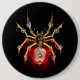 Aranha mecânica, com pá-pá de ouro, engrenagens de latão e uma lâmpada de vidro vermelha sobre fundo preto. Estilo Steampunk.