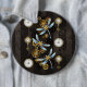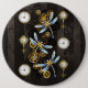 Marcadores e teclas antigas com engrenagens de ouro e latão, decoradas com libélulas mecânicas e boias em fundo castanho e listrado.