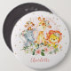 Crachá redondo feminino com animais bonitos de safari: elefante, macaco, girafa e leão. Clique no botão "Personalizar mais" se desejar alterar o estilo da fonte, as cores / reorganizar o posicionamento do texto.