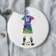 Dynamic watercolor-style silhouette of a female soccer player standing confidently with a ball. The vivid mix of blue, yellow, and red splashes gives this button a bold and energetic look, perfect for soccer fans and athletes.