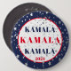 Um botão vermelho branco e azul com o nome Kamala repetiu três vezes. Um botão para apoiar Kamala para presidente na campanha de 2024. candidato democrático Kamala para 2024 . Vermelho, branco e azul.