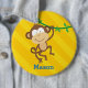 Botão personalizado/Pin que caracteriza um macaco engraçado na selva com um fundo amarelo da listra. Design bonito e do divertimento para o special para meninos. Presente monogrammed feito sob encomenda. Para nenhuma personalização, texto da amostra da supressão e vazio da licença.