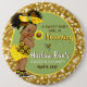 Garota afro-americana com adoráveis rabos-de-cavalo afro-soprados vestindo cobrir de fralda de rúfle amarela e um macacão castanho; segurando um girassol amarelo brilhante com um fundo brilhante de brilho dourado. Excelente para chás de fraldas ou festas de aniversário temáticos de girassol ou jardim. Esquema de cores: Amarelo, castanho, verde e Dourado ©2021 Miss Sassy Party Designs