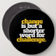Adicione um toque de inspiração e motivação ao seu traje com este botão, que mostra as palavras "mudar é apenas a palavra mais curta para desafiar." Design e Copiar © W.H. Sim. Todos os Direitos Reservados. Mais informações em zazzle.com/wordsofwhimsy