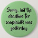 Esta é uma design de tipografia típica minimalista que diz Desculpe, mas o prazo para reclamações foi ontem, em uma bonito letra de caligrafia negra em um fundo verde. Você pode escolher uma cor de fundo diferente na ferramenta design. #botão #engraçado