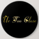 Ur Too Close button in gold with hearts on black background. Pin it in front or on your backpack viewed by those behind you. The hearts soften the message to social distance.