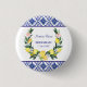 Este moderno e elegante belo cítrico italiano em aquarela limões coroa com rosas cor-de-rosa no padrão de azulejos azuis italianos Mediterrâneo, personalizado Damas de honra moderno azul letra elegante tipografia presente Chá de Noiva Botão, torná-los únicos para o seu dia memorável. Fácilmente personalizável e editável texto.
