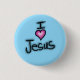 Eu Amo Jesus Eu Corto Jesus Bebê Botão Azul. Diga-lhes como se sente sobre Jesus! A mão escreveu texto preto com um coração cor-de-rosa brilhante. Personalizar cor e texto de fundo. Aproveite!
