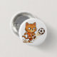 Botão redondo com um gato laranja chutando uma bola de futebol com uma expressão intensa. Um botão esportivo divertido para mochilas, jaquetas ou roupas casuais.