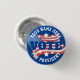 Um botão de campanha vermelho, branco e azul com uma bandeira e estrelas.