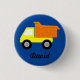 Um belo caminhão de brinquedo. Botões personalizados. Fundo azul. Edite o nome para personalizar esses botões. Ideia de presente para crianças.