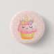 Botão com desenho de aquarela de um cupcake com gelo cor-de-rosa, um chifre unicórnio e rosas coloridos.