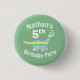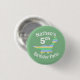 O dinossauro stripy verde e azul dos desenhos animados na idade personalizada do aniversário do miúdo bonito abotoa-se.