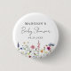 Botão Elegante de chá de fraldas floral com uma borda inferior de flores silvestres e folhagem de cor d'água em tons de rosa, amarelo, roxo, azul e verde em um fundo branco. Personalize o botão do chá de fraldas de flor silvestre com o nome da futura mãe e a data. Os botões personalizados de flor silvestre são perfeitos para chás de fraldas de primavera e verão.