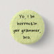 Este design de botão redondo mostra uma página de notebook amarela, ligeiramente amassada, com as palavras erradas, "Yo, eu sou korrectin seu grammer, mano." É para pessoas sarcásticas que ficam fartas de todos os esnobes gramaticais, passivos e agressivos anais que estão sempre "corrigindo silenciosamente sua gramática". Quer você seja um escritor cansado das edições de linha do seu editor ou você goste de deixar professores de inglês zangados, este é o botão para você, mano.