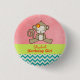 Diga a todos que você é a aniversariante com este lindo botão adorável. Personalize com seu nome. Um desenho animado de um adorável macaco marrom sentado. Ela tem bochechas cor-de-rosa e azuis para uma cutena kawaii adicional. Uma pequena flor de laranja no cabelo. Diversão e design capricho. Colocado sobre um plano de fundo com uma textura cor-de-rosa shabby e um padrão chevron azul-verde com uma faixa de banner de verde limão onde o texto é escrito.