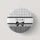 Um botão de padrão preto e branco, no estilo feminino vitoriano, com bolinhas cúbica no topo, na moda na parte inferior. Personalize este pino em moda, adicionando seu nome ao divisor do local do ilhélio embelezado com uma fita preta de tendência amarrada em um arco. Imagem impressa plana, não local real.