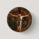 Jesus no botão da cruz tem uma cruz arborizada com Jesus pendurado nela e um fundo castanho