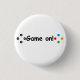 Jogue! Botão Este botão tem o logotipo Game On! com os botões de uma controladora em ambos os lados do texto. Esta imagem está disponível em quadrados e redondos e em vários tamanhos. O logotipo é um design digital.