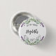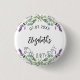 Um botão para uma festa ao estilo do país francês, qualquer idade. Um fundo branco chico decorado com flores lavandas e verde de eucalipto. O texto: O nome é escrito com um grande script de estilo escrito à mão. Personalize e adicione uma data, nome e idade. Pode ser usado como um lembrete de data para seus convidados ou como um favor do partido.
