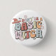 Um poster lúdico e colorido com a frase "Não Seja uma Bruxa Básica" em letras negrito e caprichosa. A design inclui um chapéu de bruxa, flores sorridentes e morcegos bonitos, perfeito para um Halloween divertido ou decoração sazonal com uma reviravolta moderna e alegre.