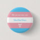 Este design apresenta listras azuis, cor-de-rosa e branca da bandeira Transgender. O texto no botão diz "Meus pronomes são Ela/Ela/Ela. Há uma área de modelo para você adicionar seus próprios pronomes. Abaixo dos pronomes está o símbolo transgênero.