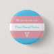 Este design apresenta listras azuis, cor-de-rosa e branca da bandeira Transgender. O texto no botão diz "Meus pronomes são Eles/Eles/herdeiros. Há uma área de modelo para você adicionar seus próprios pronomes. Abaixo dos pronomes está o símbolo transgênero.