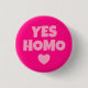 Bonito botão de orgulho gay HOMO YES com coração de amor, cor-de-rosa.