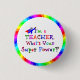 Botão colorido, de desenho personalizado, de super-herói do professor, com círculo multicolorido.